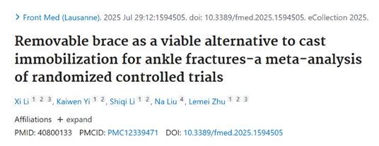 Li X, Yi K, Li S, Liu N, Zhu L. Removable brace as a viable alternative to cast immobilization for ankle fractures-a meta-analysis of randomized controlled trials. Front Med. 2025;12:1594505.